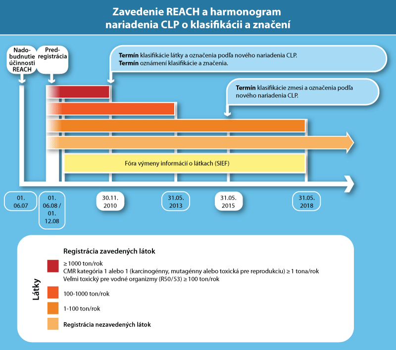 Keďže hlavným nástrojom komunikácie v rámci predpisu REACH sú karty bezpečnostných údajov, zostanú tu uvedené ustanovenia o kartách bezpečnostných údajov. Hlavné zmeny, ktoré zavedie nariadenie CLP Nariadenie dodržuje terminológiu GHS: pojem „látka“ sa zachováva, ale pojem „prípravok“ sa nahrádza pojmom „zmes“; pojem „kategória nebezpečenstva“ sa nahrádza pojmom „trieda nebezpečenstva“. Trieda nebezpečenstva predstavuje povahu fyzikálneho, zdravotného alebo environmentálneho nebezpečenstva. Niektoré triedy nebezpečenstva môžu obsahovať diferenciácie, iné triedy zase môžu obsahovať kategórie nebezpečenstiev. Klasifikačné kritériá dvoch systémov, t.j. pravidlá, ktoré sa používajú na definovanie triedy nebezpečenstva, do ktorej patrí chemikália, a kategórie v rámci tejto triedy sa môžu odlišovať. Okrem toho budú zmeny medzných hodnôt a výpočtových metód zmesí pravdepodobne viesť k tomu, že sa do nového systému bude klasifikovať viacej chemikálií. Značenie na základe nariadenia zahrňuje prvky, ktoré sú vo väčšine prípadov odlišné od aktuálne používaných na pracovisku v Európe. Požadovanými informáciami sú identifikačné znaky výrobku, identita dodávateľa, piktogramy nebezpečenstiev, signálne slová, vety nebezpečenstiev a bezpečnostné vyhlásenia. Podrobnosti si pozrite na značiacich prvkoch pre fyzikálne nebezpečenstvá, zdravotné nebezpečenstvá a environmentálne nebezpečenstvá. Prechod medzi dvoma systémami Počas prechodného obdobia zabezpečuje nariadenie existenciu súčasného aj budúceho systému. Od 1. decembra 2010 sa budú označenia látok zostavovať podľa nového systému CLP, pričom v listoch bezpečnostných údajov sa bude uvádzať súčasne aktuálny systém s novým systémom. Do 1. júna 2015 majú podniky zodpovedné na značenie chemikálií možnosť výberu jedného z dvoch systémov pre zmesi. Ak si vyberú nový systém, označenie sa musí vypracovať v súlade týmto systémom, pričom v liste bezpečnostných údajov budú uvedené obe klasifikácie. Od 1. júna 2015 sa súčasné smernice zrušia a kompletne sa nahradia nariadením CLP.