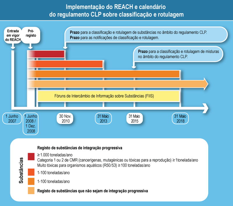 Como as fichas de dados de segurança são o instrumento principal de comunicação no âmbito do regulamento REACH, é lá que as disposições sobre as fichas de dados de segurança permanecerão. Alterações principais introduzidas pelo regulamento CLP O regulamento segue a terminologia do Sistema Mundial Harmonizado de Classificação e Rotulagem: o termo “substância” permanece, mas “preparação” é substituída por “mistura”; o termo “categoria de perigo” é substituído por “classe de perigo”. A classe de perigo traduz a natureza do perigo físico, para a saúde ou o ambiente. Algumas classes de perigo podem incluir diferenciações, enquanto que outras classes podem incluir categorias de perigos. Os critérios de classificação dos dois sistemas, ou seja, os regulamentos utilizados para definir que um produto químico pertence a uma classe de perigos e a uma categoria dentro dessa classe, podem ser diferentes. Além disso, as alterações dos valores suprimidos e os métodos de cálculo das misturas conduzirão provavelmente a mais produtos químicos integrados no novo sistema. A rotulagem no âmbito do regulamento inclui elementos que, na sua maioria, são diferentes dos utilizados actualmente no local de trabalho, na Europa. A informação necessária consiste em: identificadores dos produtos, identidade do fornecedor, pictogramas dos perigos, sinais de aviso, informações sobre perigos e informações preventivas. Para mais informação, consulte os elementos dos rótulos relativos a perigos físicos, perigos para a saúde e perigos ambientais. Transição entre os dois sistemas O regulamento prevê a coexistência dos sistemas actual e CLP durante um período transitório. Em 1 de Dezembro de 2010, os rótulos das substâncias serão preparados de acordo com o novo sistema CLP, mas a classificação no âmbito do actual sistema terá ainda de ser referida na ficha de dados de segurança do novo regulamento. Até 1 de Junho de 2015, as empresas encarregadas dos rótulos dos produtos químicos serão livres de utilizar um ou os dois sistemas para misturas. No caso de ser escolhido o novo sistema, o rótulo deverá ser preparado de acordo com ele, mas as classificações terão de aparecer na ficha de dados de segurança. A partir de 1 de Junho de 2015, as directivas actuais serão anuladas e substituídas na íntegra pelo regulamento CLP.